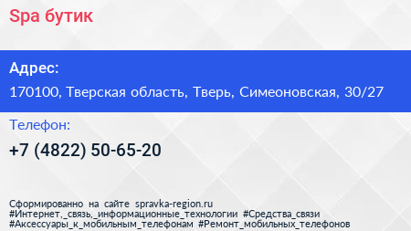 Spa-бутик по адресу 170100, Тверская область, Тверь, Симеоновская, 30/27 в дальнейшем Организация, размещена в следующих категориях: