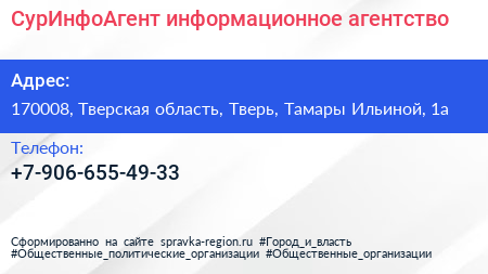 СурИнфоАгент, информационное агентство по адресу 170008, Тверская область, Тверь, Тамары Ильиной, 1а в дальнейшем Организация, размещена в следующих категориях: