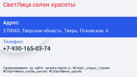 СветЛица, салон красоты по адресу 170043, Тверская область, Тверь, Псковская, 6 в дальнейшем Организация, размещена в следующих категориях: