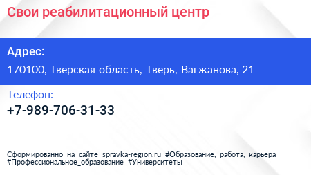 Свои, реабилитационный центр по адресу 170100, Тверская область, Тверь, Вагжанова, 21 в дальнейшем Организация, размещена в следующих категориях:
