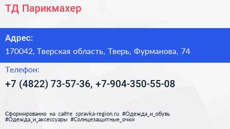 ТД Парикмахер по адресу 170042, Тверская область, Тверь, Фурманова, 74 в дальнейшем Организация, размещена в следующих категориях: