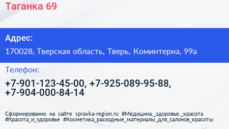 Таганка 69 по адресу 170028, Тверская область, Тверь, Коминтерна, 99а в дальнейшем Организация, размещена в следующих категориях: