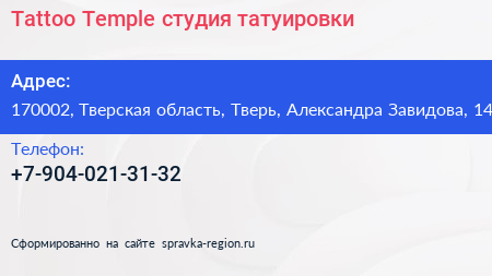 Tattoo Temple, студия татуировки по адресу 170002, Тверская область, Тверь, Александра Завидова, 14 в дальнейшем Организация, размещена в следующих категориях: