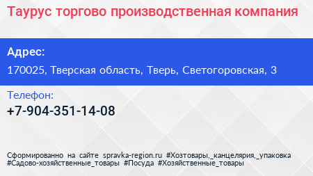 Таурус, торгово-производственная компания по адресу 170025, Тверская область, Тверь, Светогоровская, 3 в дальнейшем Организация, размещена в следующих категориях: