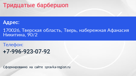 Тридцатые, барбершоп по адресу 170026, Тверская область, Тверь, набережная Афанасия Никитина, 90/2 в дальнейшем Организация, размещена в следующих категориях: