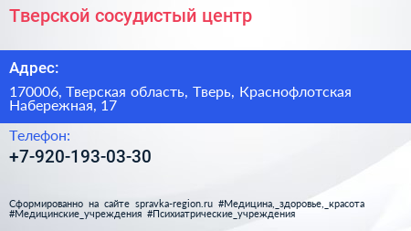 Тверской сосудистый центр по адресу 170006, Тверская область, Тверь, Краснофлотская Набережная, 17 в дальнейшем Организация, размещена в следующих категориях: