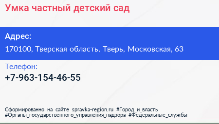 Умка, частный детский сад по адресу 170100, Тверская область, Тверь, Московская, 63 в дальнейшем Организация, размещена в следующих категориях: