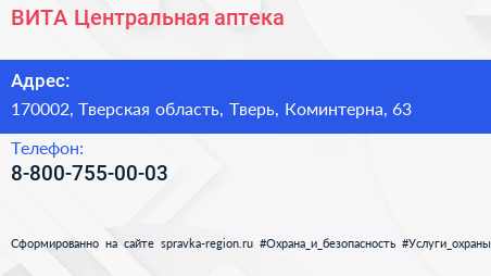 ВИТА Центральная, аптека по адресу 170002, Тверская область, Тверь, Коминтерна, 63 в дальнейшем Организация, размещена в следующих категориях: