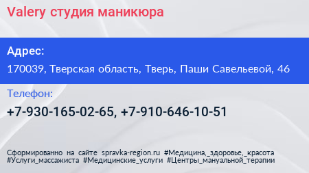 Valery, студия маникюра по адресу 170039, Тверская область, Тверь, Паши Савельевой, 46 в дальнейшем Организация, размещена в следующих категориях: