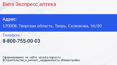 Вита Экспресс, аптека по адресу 170008, Тверская область, Тверь, Склизкова, 56/20 в дальнейшем Организация, размещена в следующих категориях: