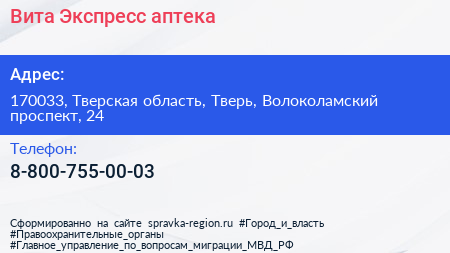 Вита Экспресс, аптека по адресу 170033, Тверская область, Тверь, Волоколамский проспект, 24 в дальнейшем Организация, размещена в следующих категориях:
