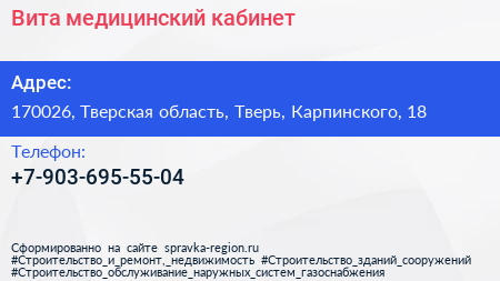 Вита, медицинский кабинет по адресу 170026, Тверская область, Тверь, Карпинского, 18 в дальнейшем Организация, размещена в следующих категориях: