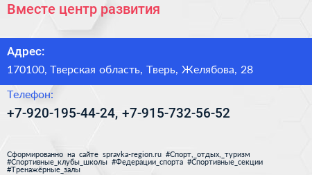 Вместе, центр развития по адресу 170100, Тверская область, Тверь, Желябова, 28 в дальнейшем Организация, размещена в следующих категориях: