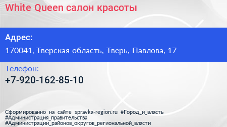 White Queen, салон красоты по адресу 170041, Тверская область, Тверь, Павлова, 17 в дальнейшем Организация, размещена в следующих категориях: