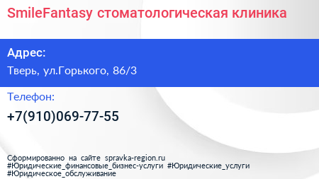 SmileFantasy - стоматологическая клиника по адресу Тверь, ул.Горького, 86/3 в дальнейшем Организация, размещена в следующих категориях: