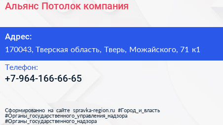 Альянс-Потолок, компания по адресу 170043, Тверская область, Тверь, Можайского, 71 к1 в дальнейшем Организация, размещена в следующих категориях: