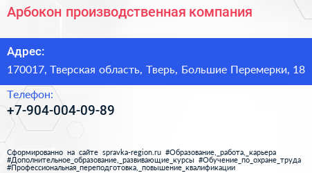 Арбокон, производственная компания по адресу 170017, Тверская область, Тверь, Большие Перемерки, 18 в дальнейшем Организация, размещена в следующих категориях:
