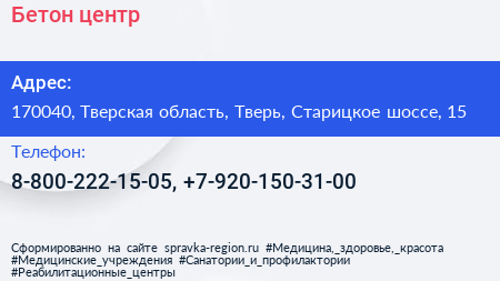 Бетон-центр по адресу 170040, Тверская область, Тверь, Старицкое шоссе, 15 в дальнейшем Организация, размещена в следующих категориях: