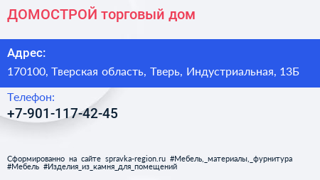 ДОМОСТРОЙ, торговый дом по адресу 170100, Тверская область, Тверь, Индустриальная, 13Б в дальнейшем Организация, размещена в следующих категориях: