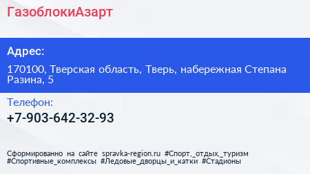 ГазоблокиАзарт по адресу 170100, Тверская область, Тверь, набережная Степана Разина, 5 в дальнейшем Организация, размещена в следующих категориях: