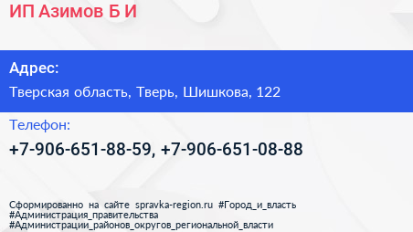 ИП Азимов Б.И. по адресу Тверская область, Тверь, Шишкова, 122 в дальнейшем Организация, размещена в следующих категориях: