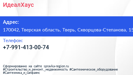 ИдеалХаус по адресу 170042, Тверская область, Тверь, Скворцова-Степанова, 15 в дальнейшем Организация, размещена в следующих категориях: