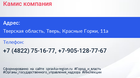 Камис, компания по адресу Тверская область, Тверь, Красные Горки, 11а в дальнейшем Организация, размещена в следующих категориях: