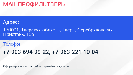 МАШПРОФИЛЬТВЕРЬ по адресу 170001, Тверская область, Тверь, Серебряковская Пристань, 15а в дальнейшем Организация, размещена в следующих категориях: