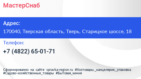 МастерСнаб по адресу 170040, Тверская область, Тверь, Старицкое шоссе, 18 в дальнейшем Организация, размещена в следующих категориях: