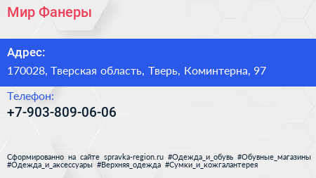 Мир Фанеры по адресу 170028, Тверская область, Тверь, Коминтерна, 97 в дальнейшем Организация, размещена в следующих категориях: