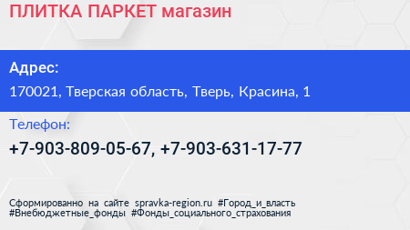 ПЛИТКА & ПАРКЕТ, магазин по адресу 170021, Тверская область, Тверь, Красина, 1 в дальнейшем Организация, размещена в следующих категориях: