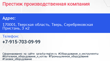 Престиж, производственная компания по адресу 170001, Тверская область, Тверь, Серебряковская Пристань, 3 к2 в дальнейшем Организация, размещена в следующих категориях: