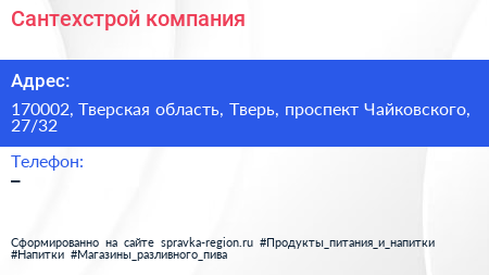 Сантехстрой, компания по адресу 170002, Тверская область, Тверь, проспект Чайковского, 27/32 в дальнейшем Организация, размещена в следующих категориях:
