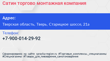 Сатин, торгово-монтажная компания по адресу Тверская область, Тверь, Старицкое шоссе, 21а в дальнейшем Организация, размещена в следующих категориях: