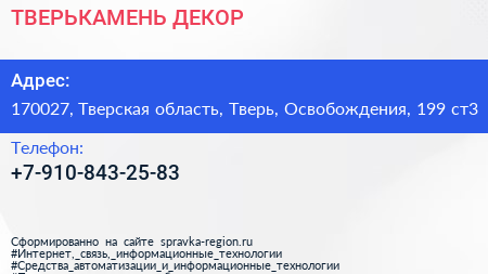 ТВЕРЬКАМЕНЬ-ДЕКОР по адресу 170027, Тверская область, Тверь, Освобождения, 199 ст3 в дальнейшем Организация, размещена в следующих категориях: