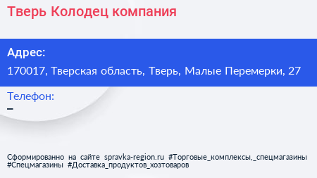 Тверь Колодец, компания по адресу 170017, Тверская область, Тверь, Малые Перемерки, 27 в дальнейшем Организация, размещена в следующих категориях: