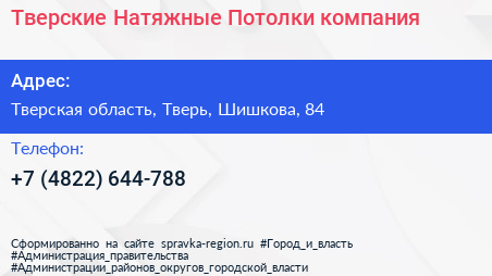 Тверские Натяжные Потолки, компания по адресу Тверская область, Тверь, Шишкова, 84 в дальнейшем Организация, размещена в следующих категориях: