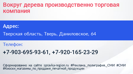 Вокруг дерева, производственно-торговая компания по адресу Тверская область, Тверь, Даниловское, 64 в дальнейшем Организация, размещена в следующих категориях: