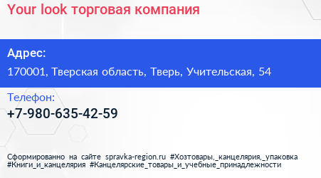 Your look, торговая компания по адресу 170001, Тверская область, Тверь, Учительская, 54 в дальнейшем Организация, размещена в следующих категориях: