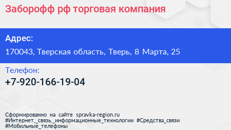 Заборофф.рф, торговая компания по адресу 170043, Тверская область, Тверь, 8 Марта, 25 в дальнейшем Организация, размещена в следующих категориях: