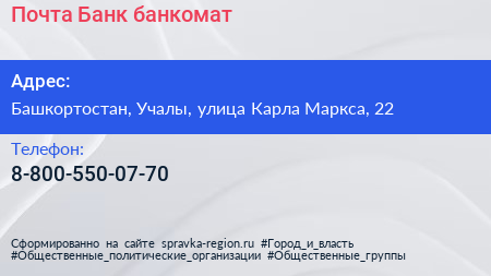 Почта Банк, банкомат по адресу Башкортостан, Учалы, улица Карла Маркса, 22 в дальнейшем Организация, размещена в следующих категориях: