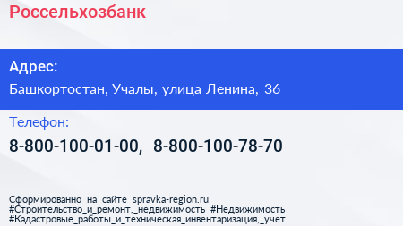 Россельхозбанк по адресу Башкортостан, Учалы, улица Ленина, 36 в дальнейшем Организация, размещена в следующих категориях: