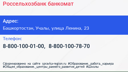Россельхозбанк, банкомат по адресу Башкортостан, Учалы, улица Ленина, 23 в дальнейшем Организация, размещена в следующих категориях: