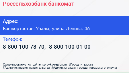 Россельхозбанк, банкомат по адресу Башкортостан, Учалы, улица Ленина, 36 в дальнейшем Организация, размещена в следующих категориях: