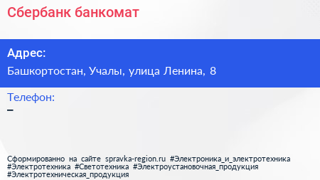 Сбербанк, банкомат по адресу Башкортостан, Учалы, улица Ленина, 8 в дальнейшем Организация, размещена в следующих категориях: