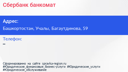 Сбербанк, банкомат по адресу Башкортостан, Учалы, Багаутдинова, 59 в дальнейшем Организация, размещена в следующих категориях:
