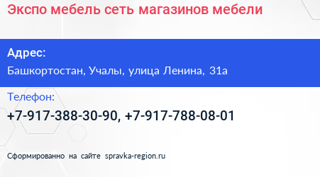 Экспо мебель, сеть магазинов мебели по адресу Башкортостан, Учалы, улица Ленина, 31а в дальнейшем Организация, размещена в следующих категориях: