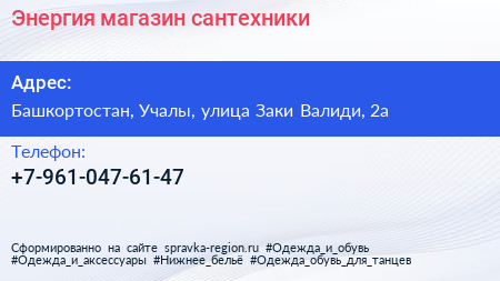 Энергия, магазин сантехники по адресу Башкортостан, Учалы, улица Заки Валиди, 2а в дальнейшем Организация, размещена в следующих категориях: