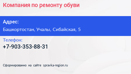 Компания по ремонту обуви по адресу Башкортостан, Учалы, Сибайская, 5 в дальнейшем Организация, размещена в следующих категориях: