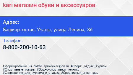 kari, магазин обуви и аксессуаров по адресу Башкортостан, Учалы, улица Ленина, 36 в дальнейшем Организация, размещена в следующих категориях: